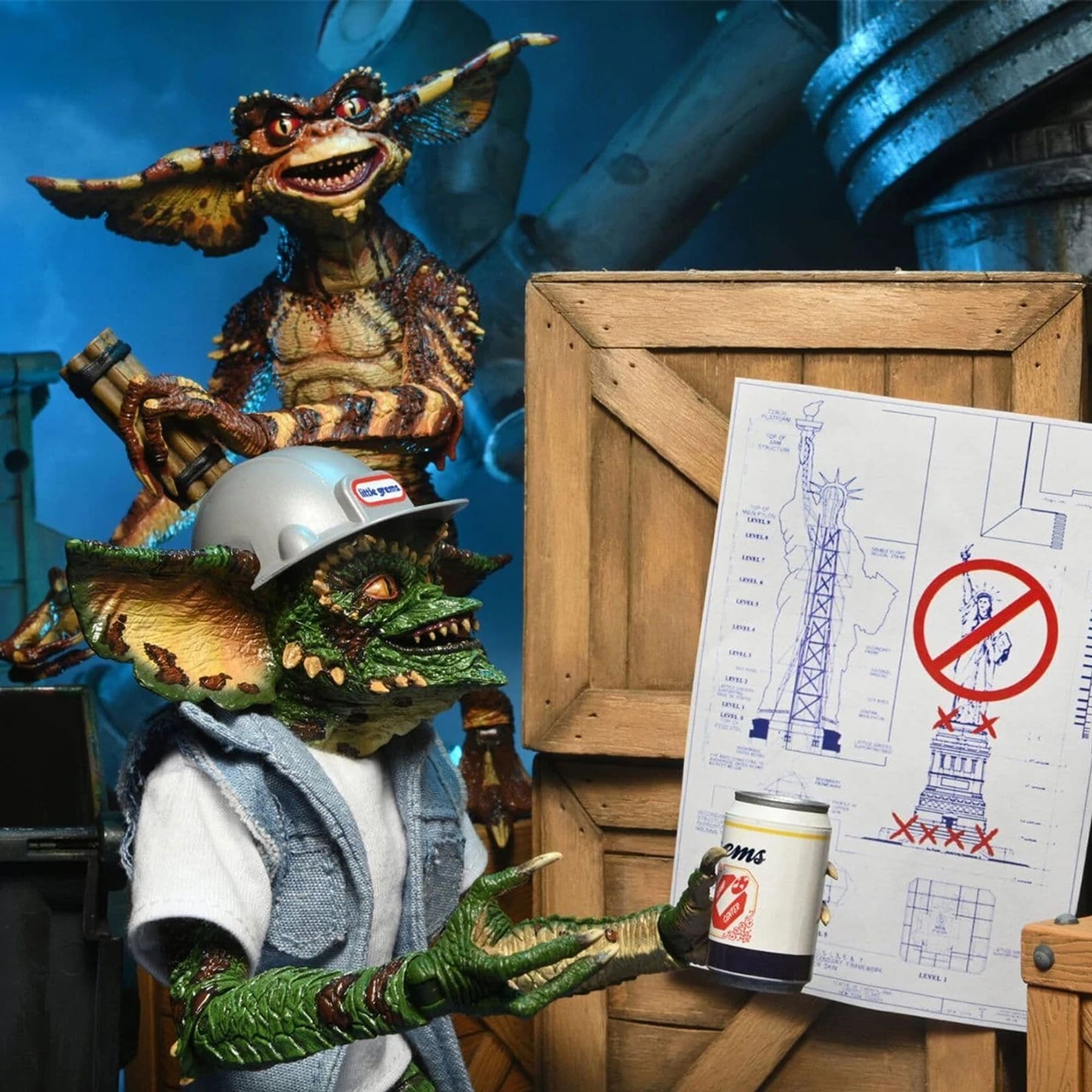 Les Gremlins sont de retour ! Et cette fois, ils ont pris le contrôle du gratte-ciel ultra-technologique d’un magnat des médias new-yorkais. Ces deux figurines articulées à l’échelle 7’’ (environ 15 cm de haut) illustrent parfaitement ce qui arrive lorsqu’un Mogwaï entre en contact avec l’eau... le chaos total ! Inspiré du film Gremlins 2: The New Batch, ce pack comprend deux Gremlins prêts à semer la pagaille, avec de nombreux accessoires : tonneau, maillet, bombe, canette, bâton de dynamite, détonateur, mains interchangeables, casque de chantier, ainsi qu’un tee-shirt et un gilet en jean en tissu. Présentées en boîte vitrine.