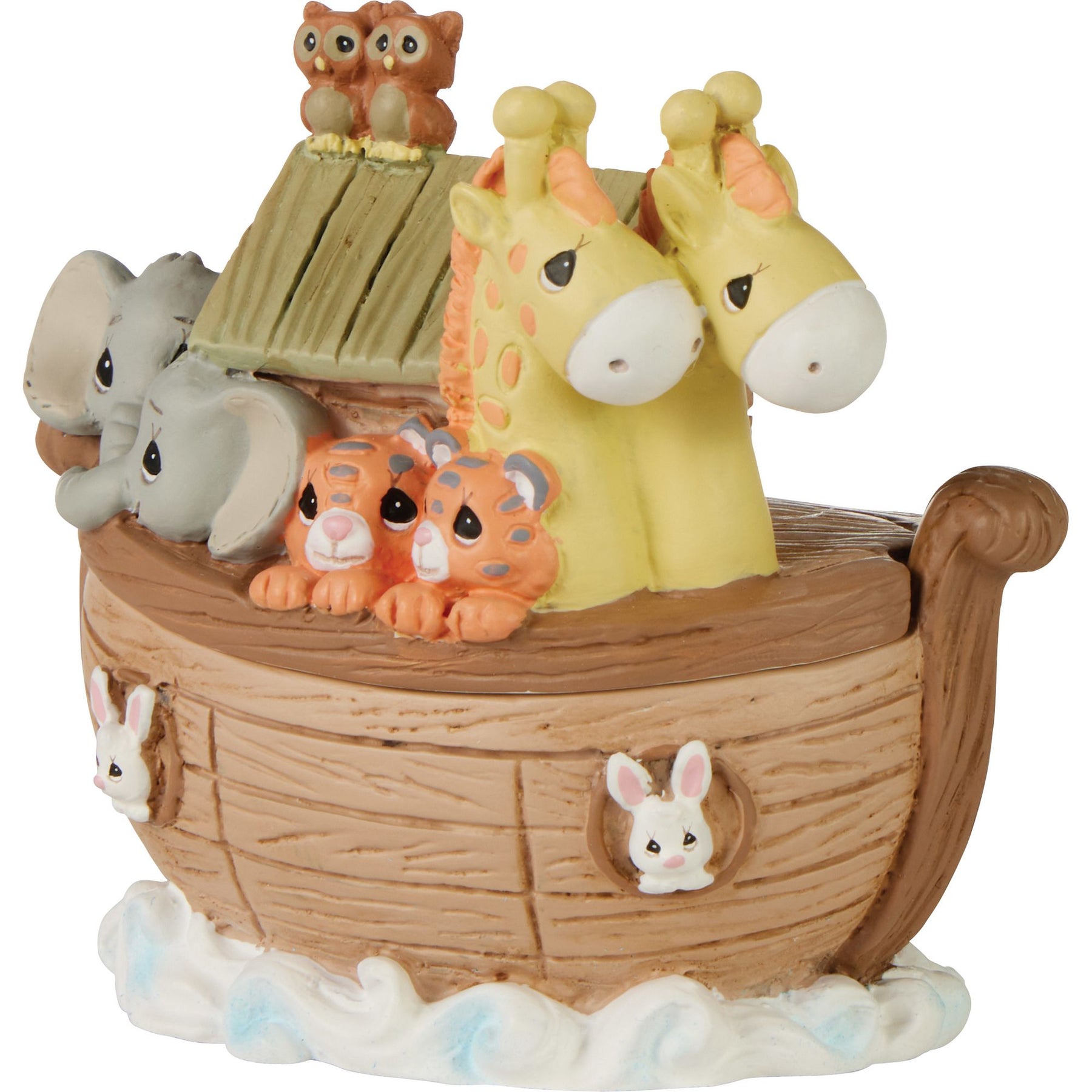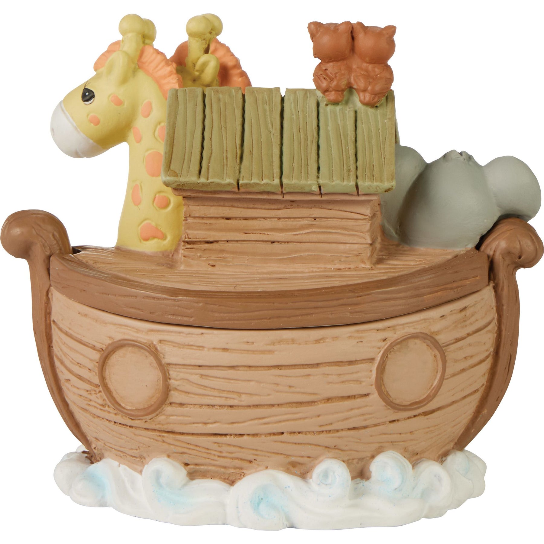 Les animaux de l’arche de Noé protègent les trésors qui se trouvent à l’intérieur. Idéale pour ranger des chapelets, souvenirs et petits objets précieux. À la fois pratique et pleine d’attention, cette jolie boîte souvenir au thème mixte est parfaite pour décorer la chambre de tout enfant. Offrez cette boîte à une fille, un garçon, un petit-enfant ou tout autre enfant pour un anniversaire, une fête, une occasion religieuse ou simplement pour lui rappeler qu’il est aimé. Mesurant environ 6,5 cm de hauteur, cette boîte souvenir est soigneusement fabriquée en résine et minutieusement peinte à la main. Ces figurines ne sont pas des jouets pour enfants. Destiné aux adultes uniquement.