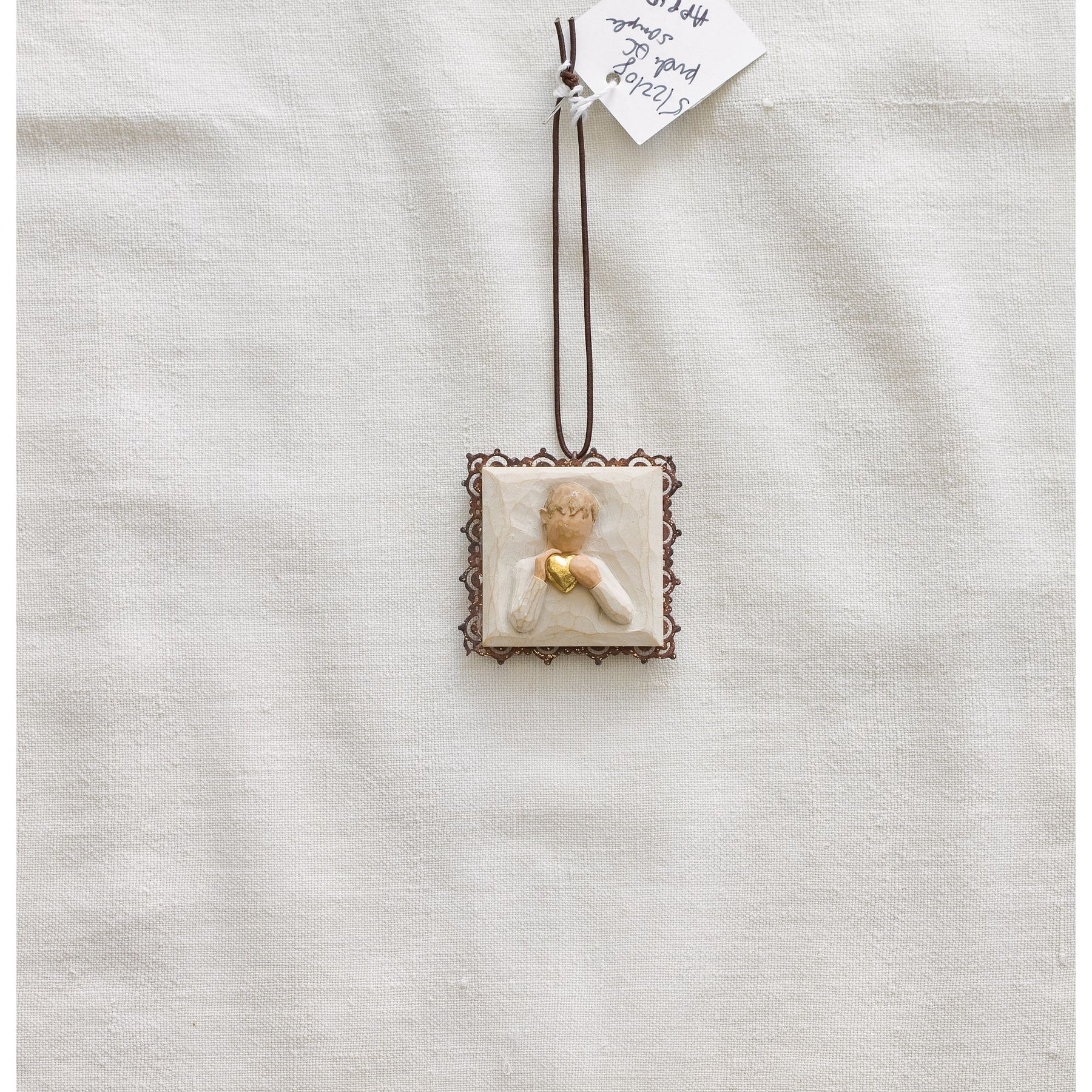 Une suspension avec une petite plaque joliement décorée, avec la représentation d'un enfant tenant un cœur en or gravée au centre.