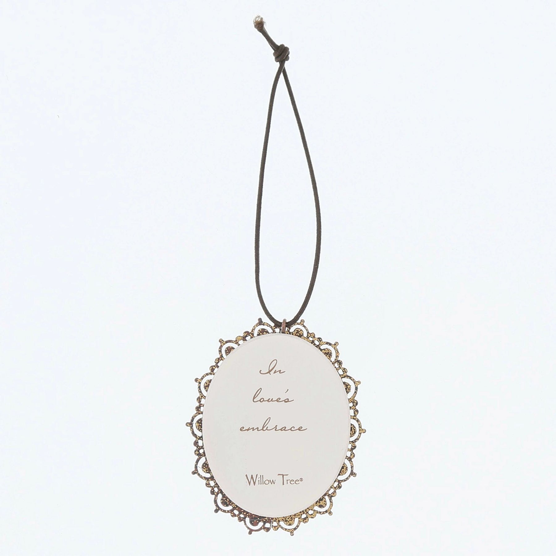 Une suspension avec une petite plaque joliement décorée, avec la représentation d'un couple gravée en son centre.